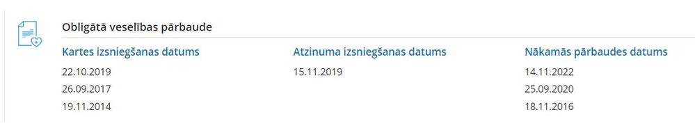 Tiešais vadītājs redzēs to pašu informāciju, ko darbinieks: kurā iestādē ir izsniegta obligātās veselības pārbaudes karte, kādā datumā karte ir izsniegta, kurā datumā ir sniegts atzinums un kad ir nākošās pārbaudes datums. Ja darbiniekam nav pašlaik aktīvs nosūtījums uz obligāto veselības pārbaudi, tad ir jāieslēdz iespēja - Rādīt visus datus, lai redzētu pašreizējās obligātās veselības pārbaudes datus.