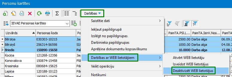 Darbības - Darbības ar WEB lietotājiem - Deaktivizēt WEB lietotājus: