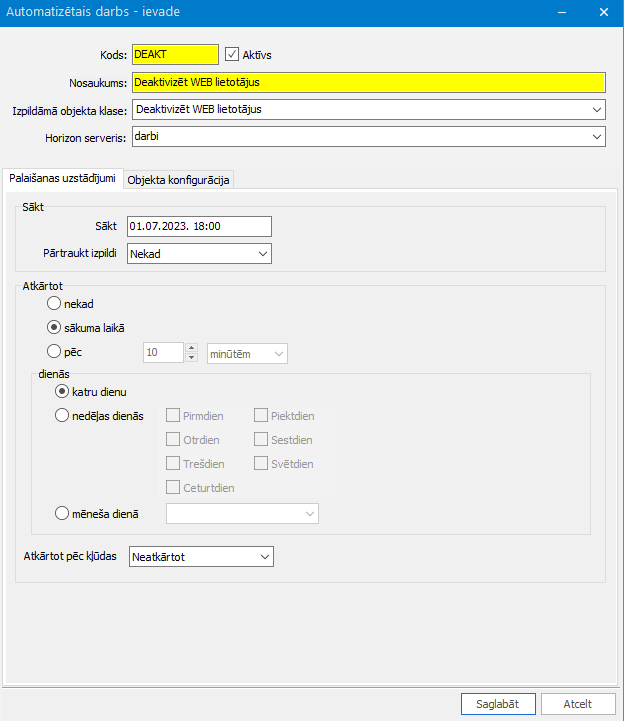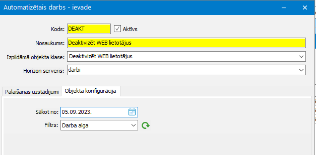 Ceļš sistēmā: Sistēma -Uzstādījumi - Automatizētie darbi - Izpildāmā objekta klase: Deaktivizēt WEB lietotājus