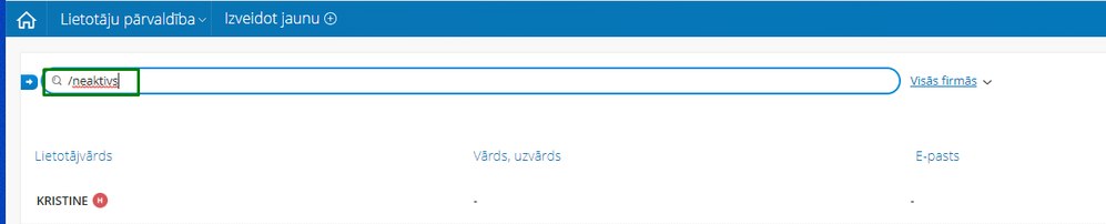 HoP lietotnē Lietotāju pārvaldība (pieejama ar HoP lomu “Pārvaldnieks”) pielieto filtru /neaktivs, kas atlasa visus neaktīvos WEB lietotājus: