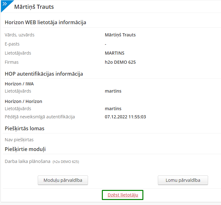 WEB lietotāja deaktivizācija Horizon nedzēš neaktīvos lietotājus no HoP moduļiem. Lai to paveiktu, jādodas uz HoP un jāveic atsaistīšana vai dzēšana.