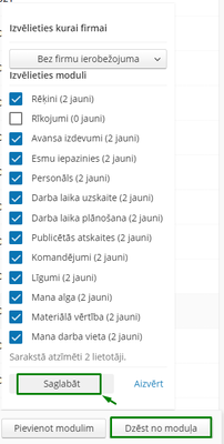 Pēc tam izvēlnes logā jāatzīmē, no kuriem moduļiem lietotājus atsaistīt un jāsaglabā izmaiņas: