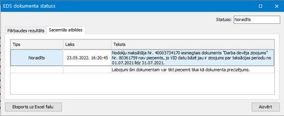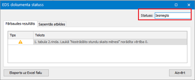 Horzion paziņojuma logā tiek uzrādīts statuss, ar kādu dokuments tiek saglabāts EDS vidē un ir iespēja pārbaudes rezultātus eksportēt uz Excel failu.