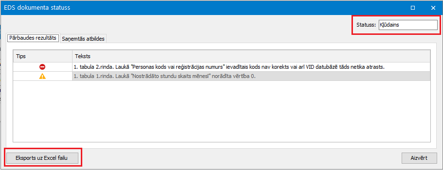 Ja ir kļūdas un/vai brīdinājumi - EDS vidē tiek izveidots jauns dokuments ar statusu Kļūdains un Horizon izdod EDS dokumenta statusa logu ar kļūdu/brīdinājumu sarakstu.