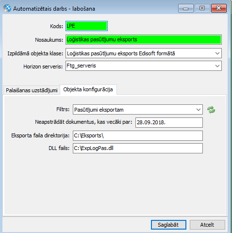 Loģistikas pasūtījumu eksporta konfigurācija jāaizpilda lappusē “Objekta konfigurācija”: