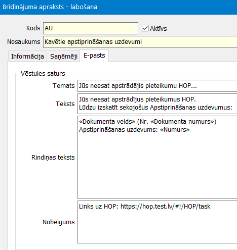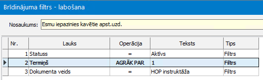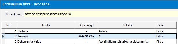 Brīdinājuma filtru veidojam no saraksta Apstiprināšanas uzdevumi (17568):