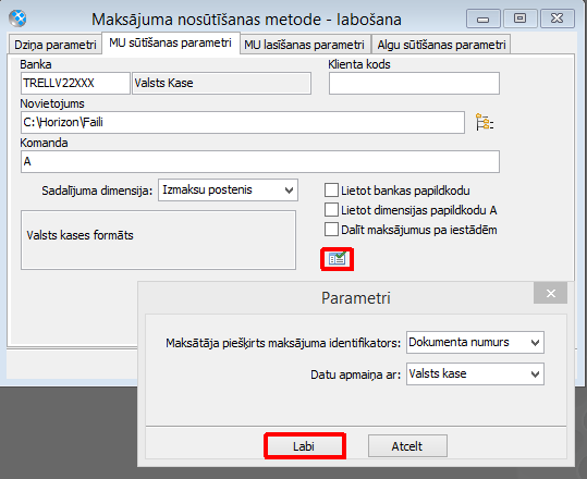 Ja maksājuma dokumenti tiek sūtīti uz Valsts Kasi, tad pēc veiktās izvēles Maksājumu sūtīšanas metodē ir jāpāriet uz lappusi MU sūtīšanas parametri, tajā jānospiež uz un atvērsies Parametru ievadlogs, kurā ir jāizvēlas parametrs – Datu apmaiņa ar Valsts kasi.