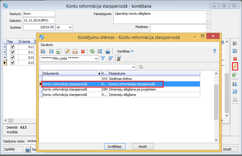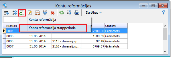 Operāciju kontu slēgšana: Dokumenti – Virsgrāmata – Kontu reformācijas – Pievienot - Kontu reformācija starpperiodā: