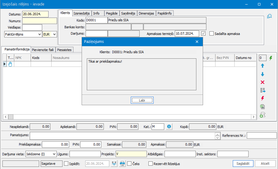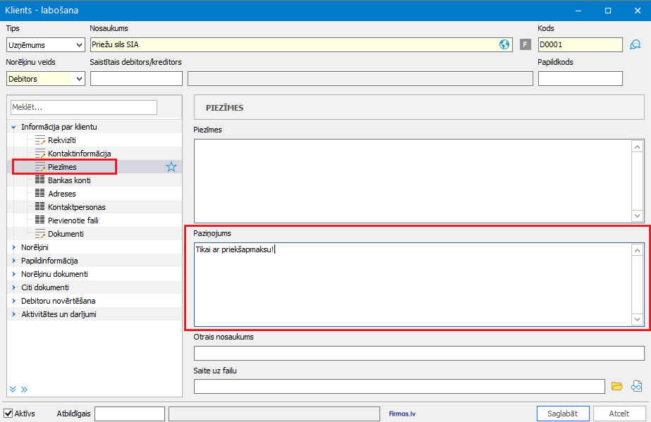 Klienta kartītes sadaļā "Piezīmes" ir pieejams lauks “Paziņojums”, kas nav tikai vēl viens teksta lauks kartītē, bet darbojas arī kā atgādinājums preču un maksājumu dokumentos.