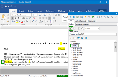 Noderīgi! Pievienotos sistēmas laukus dokumentā var iekrāsot, kontrolpanelī ieliekot ķeksi pie “izcelt laukus”. Drukājot šis krāsojums neparādās.