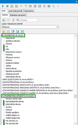 | Rīkojuma/Vienošanās pamatlauki (rīkojuma/vienošanās numurs, rīkojuma/vienošanās datums, piezīmes, sākuma/beigu datums, Summa utt.) ir atrodami zem grupas LAUKI | |