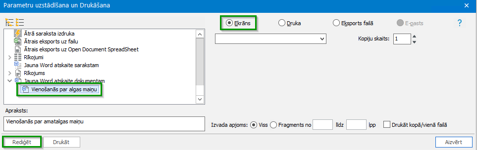 Nospiežot ikonu Drukāt , logā “Parametru uzstādīšana un Drukāšana” aktivizē “Jauna Word atskaite dokumentam” (vai sarakstam), atzīmē “Ekrāns” un nospiež Rediģēt. Tiks atvērts atskaišu redaktors (Word dokuments) un kontrolpanelis.