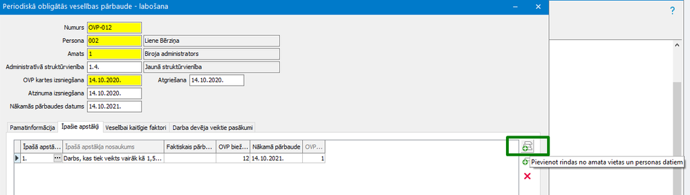 @LoretaD Pirmo reizi ģenerējot OVP karti darbiniekam, personas kartiņā vai pie amata vietas ievadītie Īpašie apstākļi un Veselībai kaitīgie faktori jāpievieno, spiežot šo pogu: