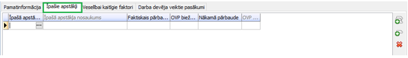 Nospiežot pogu OVP16.png, sarakstam tiek pievienota jauna rindiņa, kurā var manuāli ievadīt īpašos apstākļus, kolonnā Īpašie apstākļi ievadot datus no klasifikatora Īpašie apstākļi.