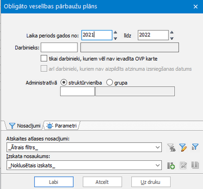 Atskaites → Personāla uzskaite → Darba aizsardzība → Obligāto veselības pārbaužu plāns