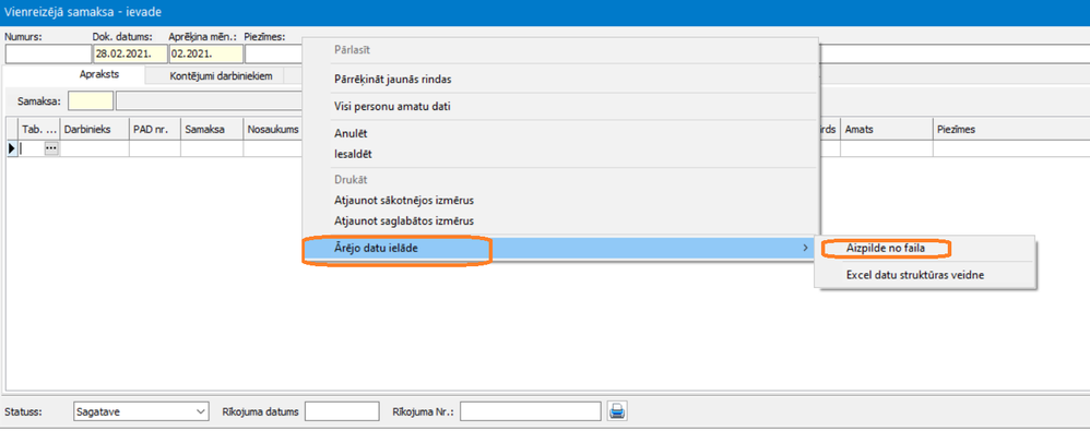 Kad veido vienreizējās samaksas dokumentu, pašā dokumentā spiež labo pogu un tad ir iespējams izvēlēties Ārējo datu ielādi.vienr_sam_adi.png