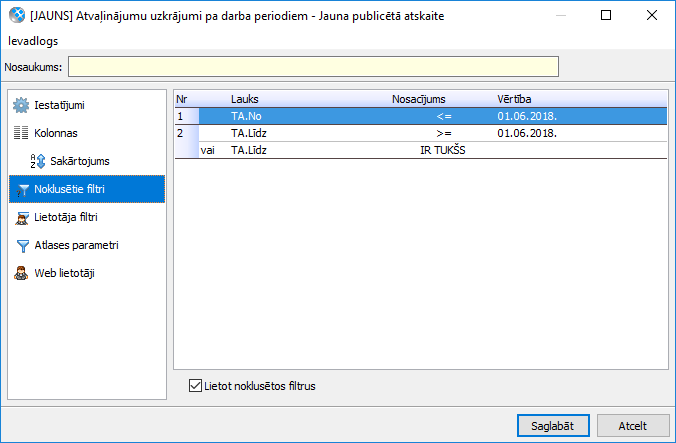 Noklusētos filtrus sistēma uzstāda automātiski un tos nav iespējams labot. Šie filtri vai nu jālieto visi kopā, kādi tiek piedāvāti, vai arī var nelietot vispār, noņemot atzīmi izvēles rūtiņai Lietot noklusētos filtrus.