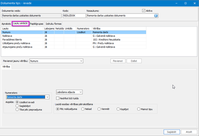 Dokumentu tipa "Lauku atribūti" sadaļā nepieciešams norādīt: