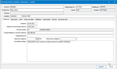 2) Sadaļā "Darba lapa" tiek detalizētāk fiksēta informācija saņemot un atgriežot pēc remonta