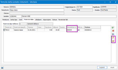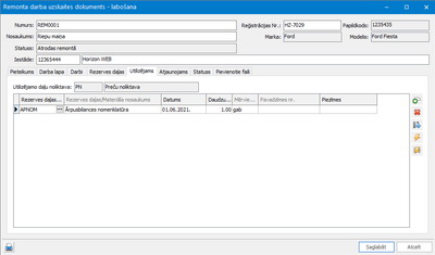 4) Sadaļā "Rezerves daļas" tiek no noliktavas izvēlētas nomenklatūras, kas tika izmantotas remonta darbu veicot. Dokumenta labajā pusē ir pogas, ar kuru palīdzību iespējams ģenerēt noliktavas norakstīšanas pavadzīmi visām rindām vai tikai iezīmētajām.