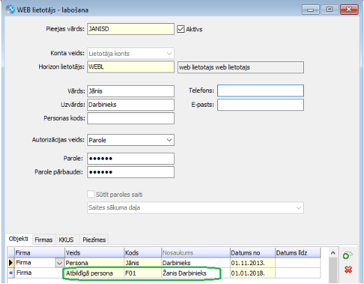 Horizon WEB lietotājam (Sistēma -> Administrēt -> WEB lietotāji) jānorāda atbildīgā persona vai personas, kuras materiālos resursus konkrētais darbinieks ir tiesisks redzēt un pārvaldīt.