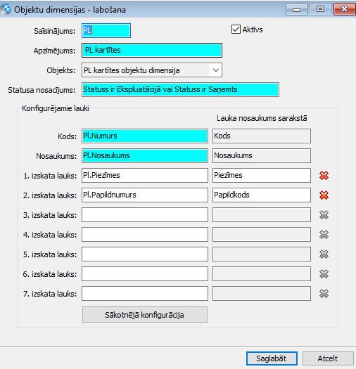 Kad objektu dimensija ir aktivizēta, nepieciešams norādīt, pie kuriem kontiem būs nepieciešams skatīt apgrozījumu konkrētās objektu dimensijas griezumā: