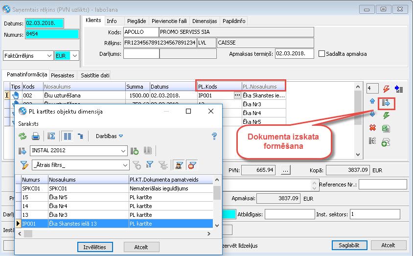 Ja dokumenta ievadlogā pievienota objektu dimensija, to var iegūt dažādās atskaitēs un sarakstos, kā piemēram: