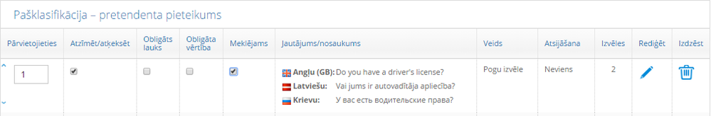Jautājumi, kuri ir pievienoti sadaļā “Pašklasifikāicja - pretendenta profils”, var tikt izmantoti arī vakances pieteikuma formās.