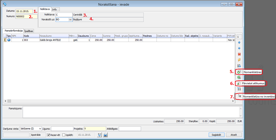 Lai veiktu inventāra norakstīšanu, jābūt aktivizētam dokumenta tipam Norakstīšanas pavadzīme.