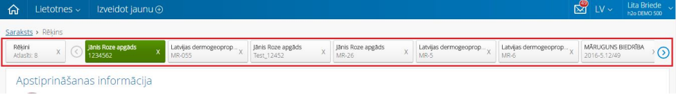 Iezīmējot vairākus rēķinus rēķinu sarakstā un nospiežot pogu ”Atvērt rēķinus”, tiks atvērta rēķina forma ar papildus navigācijas elementu - rēķinu karuselis. Karuselis ļauj pārvietoties pa izvēlētajiem rēķiniem, neatgriežoties uz sarakstu.