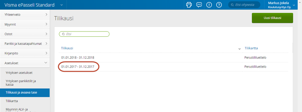 Siirry kohtaan Asetukset - Tilikausi ja avaava tase ja luo toinen tilikausi ja määritä päivämäärät edellisen tilikautesi mukaisesti. Lopputuloksena sinulla on ohjelmassasi edellinen tilikausi sekä nykyinen tilikausi.