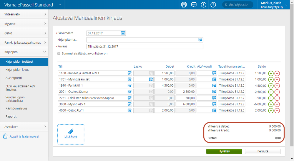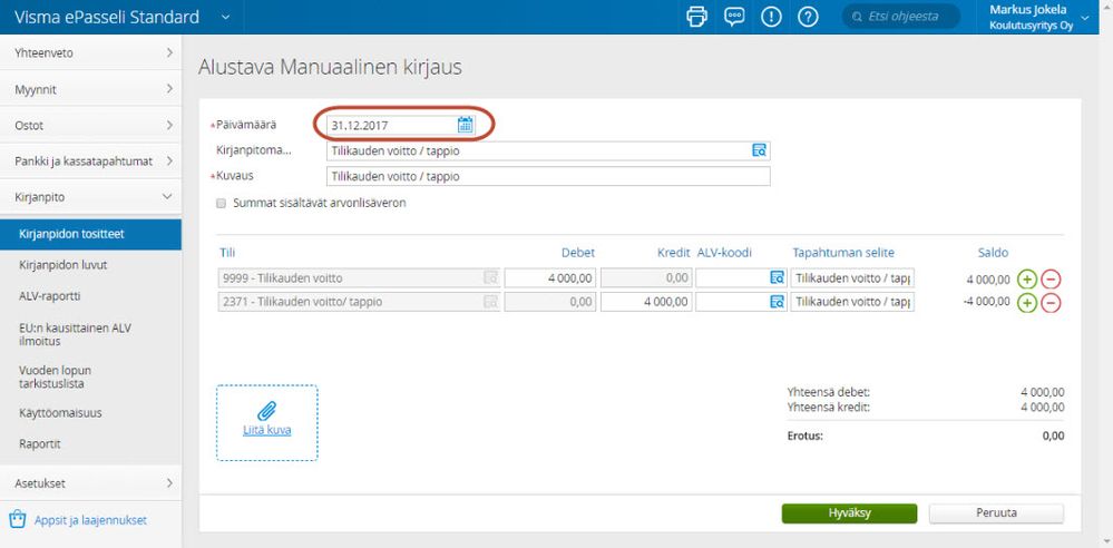 Siirry kohtaan Kirjanpito - Kirjanpidon tositteet. Luo uusi tosite manuaalisesti ohjelmaan ja aseta päivämääräksi vertailukauden viimeinen päivämäärä, eli tässä esimerkissä määritän tilikauden viimeisen päivän, koska syötän koko vuoden tapahtumat kerralla. Huomioi tositetta syötettäessäsi että tositteen saldot menevät aina tasan Debet ja Kredit tilien osalta.