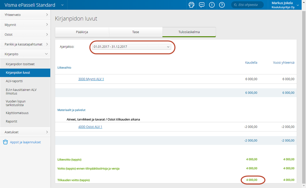 Siirry kohtaan Kirjanpito - Kirjanpidon luvut. Valitse välilehti Tuloslaskelma ja valitse Ajanjaksoksi edellinen tilikausi. Näet täällä kootusti tilikautesi tuloslaskelman ja näkymän alareunasta löytyy Tilikauden voitto (tappio) saldo.