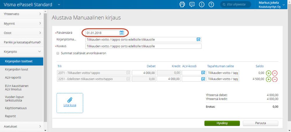 Nyt vertailutiedot ovat syötetty, joten viimeistelläksesi edellisen tilikauden ohjelmallisesti, niin sinun täytyy vielä kirjata edellisen tilikauden voitto/tappion omalle tililleen.